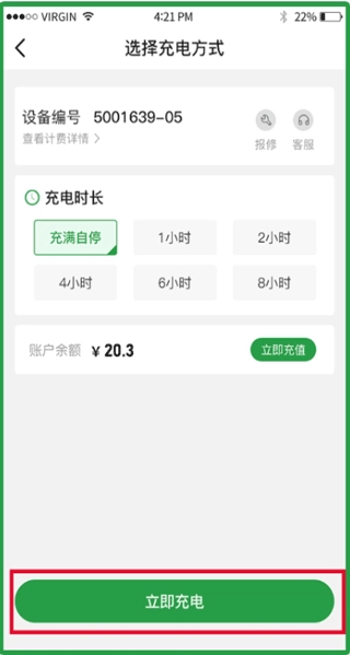 四、进入充电下单页面,选择充电时长后点击立即充电