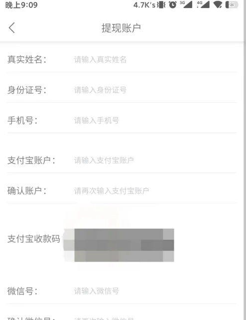 3、进入提现账户界面后,依次填写真实姓名、身份证号、手机号、支付宝账户、确认账户,上传支付宝收款码,填写微信号并上传微信收款码,以及银行卡账户等各项信息,最后点击下方的确认按钮即可完成操作。