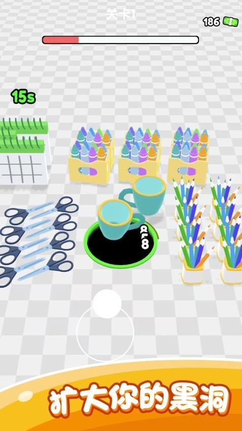 1、通过屏幕操控洞口移动,靠近物品时会自动将其吞噬,要注意避开那些无法吞下的障碍;