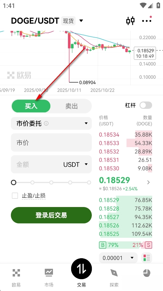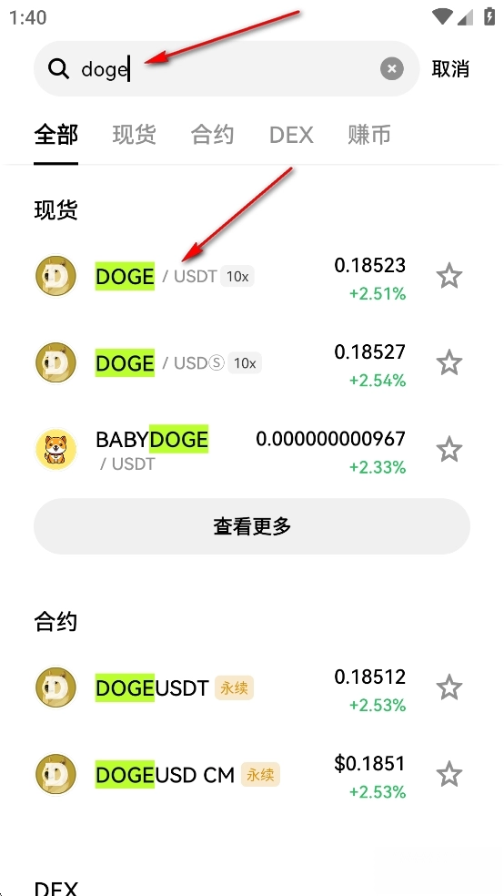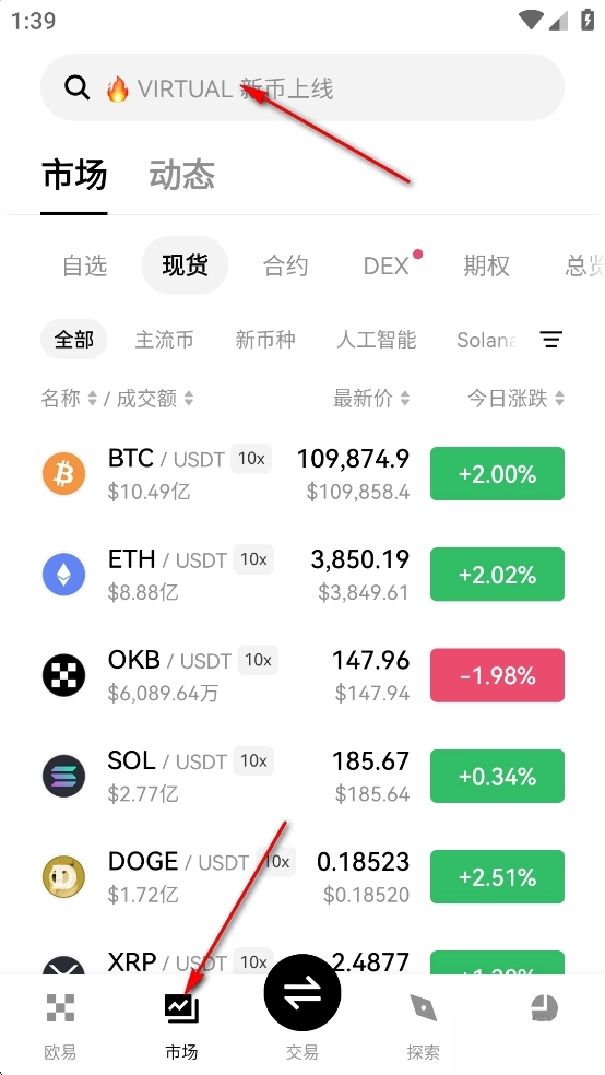 在搜索栏输入想购买的代币名称或合约地址,或在行情页面的列表中查找。