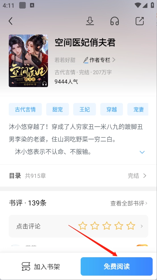 1、点开喜欢的小说进入详情页,点击“免费阅读”。