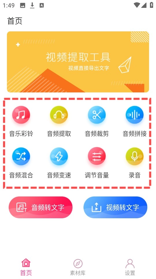 成功进入首页后,我们能看到音频拼接、音频裁剪等多种功能。