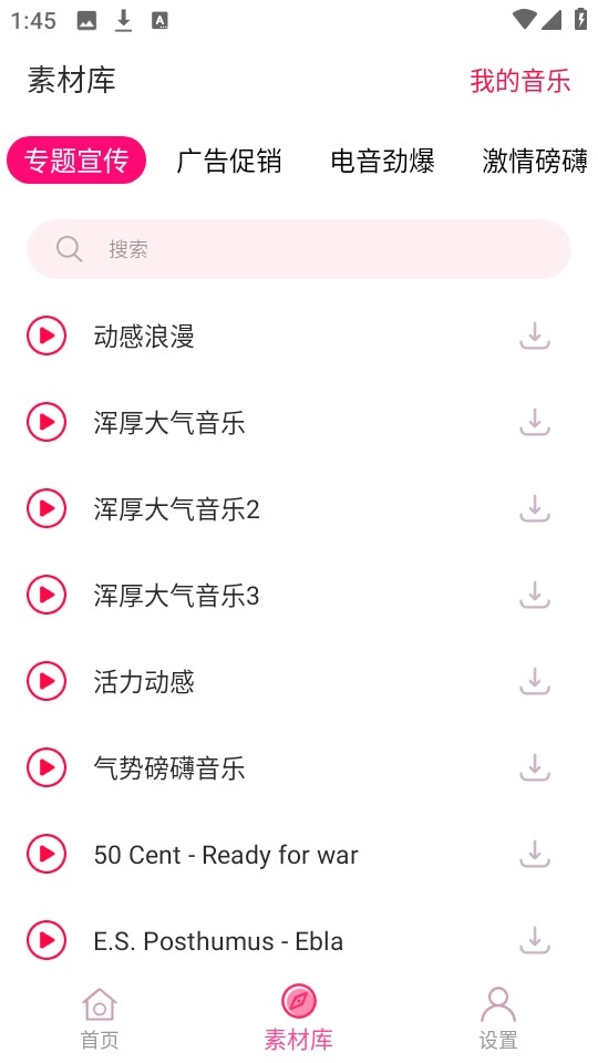3、随后点击下方的“素材库”,就能看到里面丰富多样的音乐素材内容了。