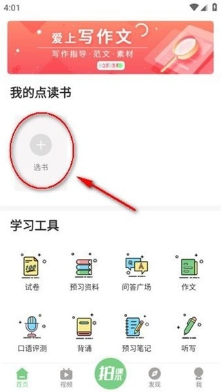 1、打开爱点读正版后,就在“首页”点击“选书”,如图所示;
