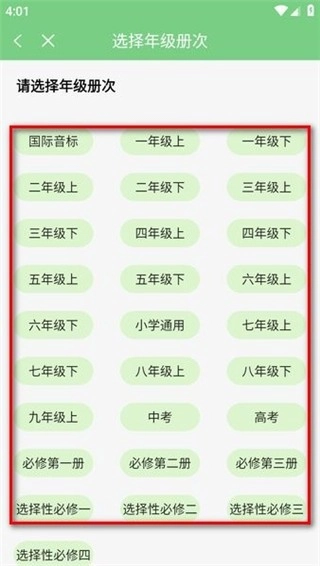 2、接着选择“年级册次”,这里涵盖了从一年级上册到九年级的所有年级,此外还包含中考、高考以及国际音标相关内容。