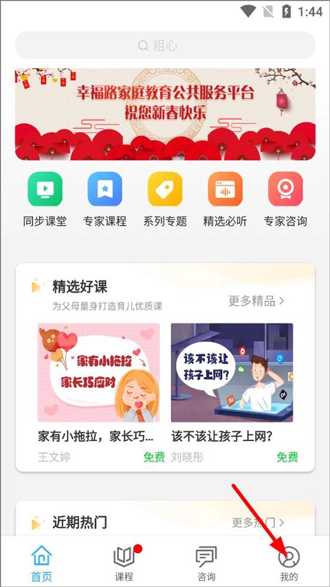 1、进入幸福路家庭教育平台的首页后,用户能在页面上浏览到同步课堂、专家课程、系列专题、近期热门、精选好课等内容,随后点击“我的”选项;