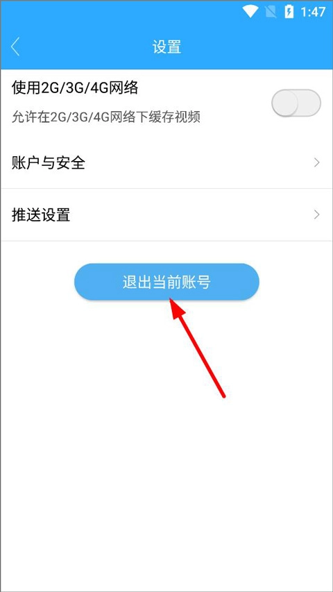3、进入设置界面后,用户能够进行多项操作:设置是否允许在2G/3G/4G网络环境下缓存视频、查看账户与安全相关信息、调整推送设置等;若要切换账号,只需点击退出当前账号,然后重新登录新账号即可。