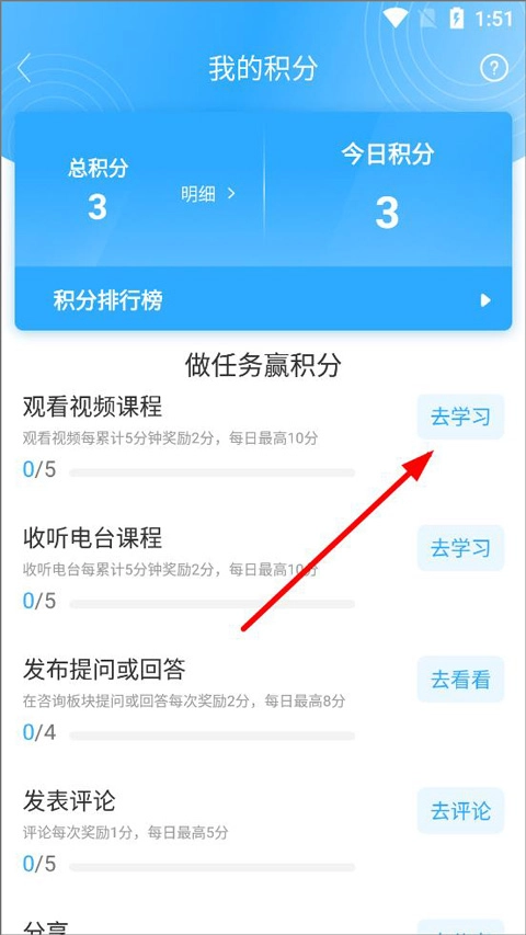 3、进入我的积分页面后,用户能够查看总积分与今日积分,点击“做任务赢积分”板块下的任务栏,通过完成学习或评论任务,就能获取对应的积分奖励。