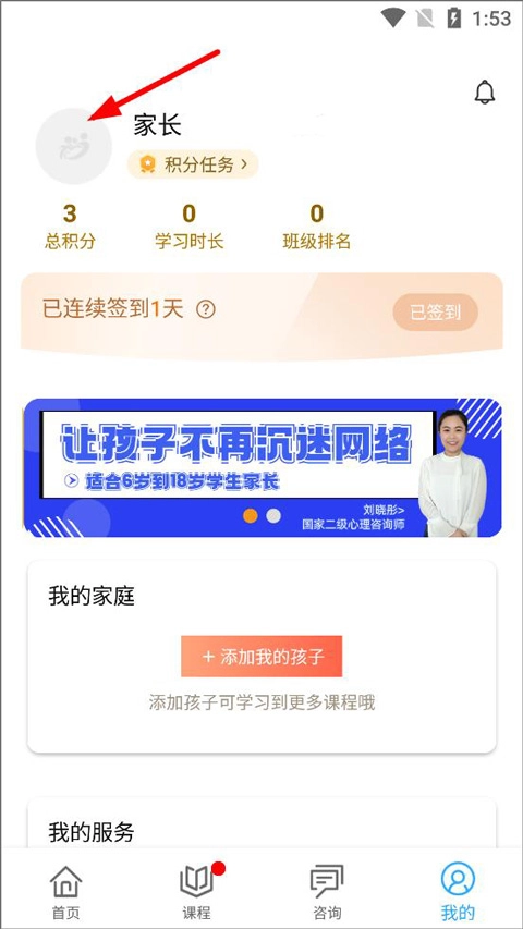 2、我的页面中用户可查看积分、排名、我的家庭、我的服务等,点击家长昵称下的积分任务;
