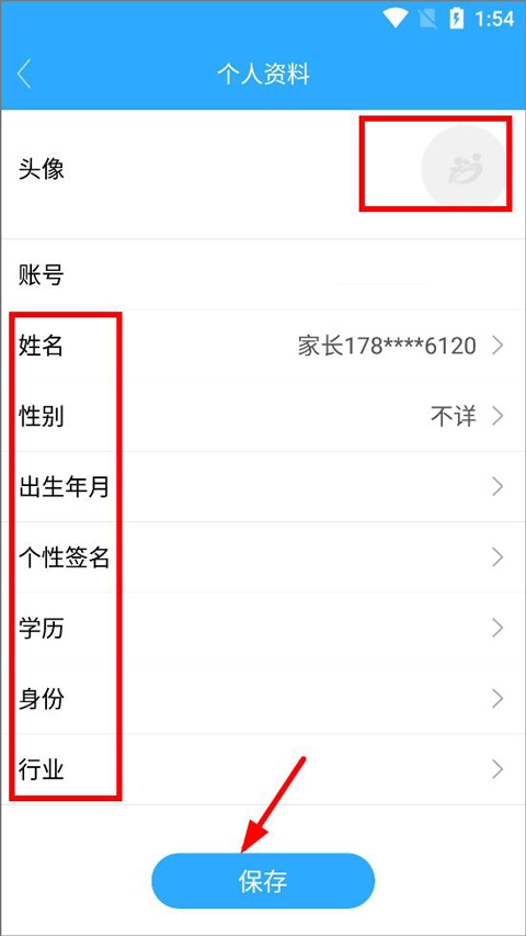 进入个人资料页面后,用户能够更换头像,修改姓名、性别、出生年月、个性签名、学历、身份、行业等信息,点击保存按钮即可完成修改。