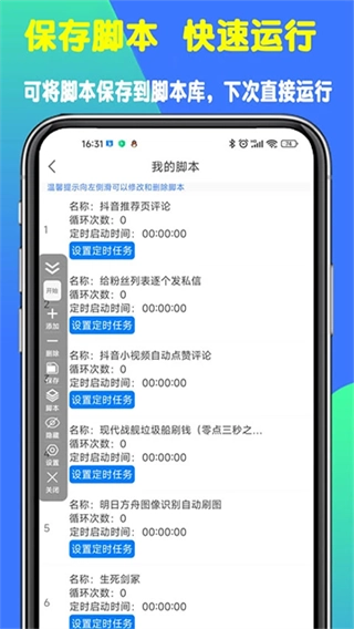3、支持自定义脚本的储存与加载,同时具备定时启动和定时停止的功能。