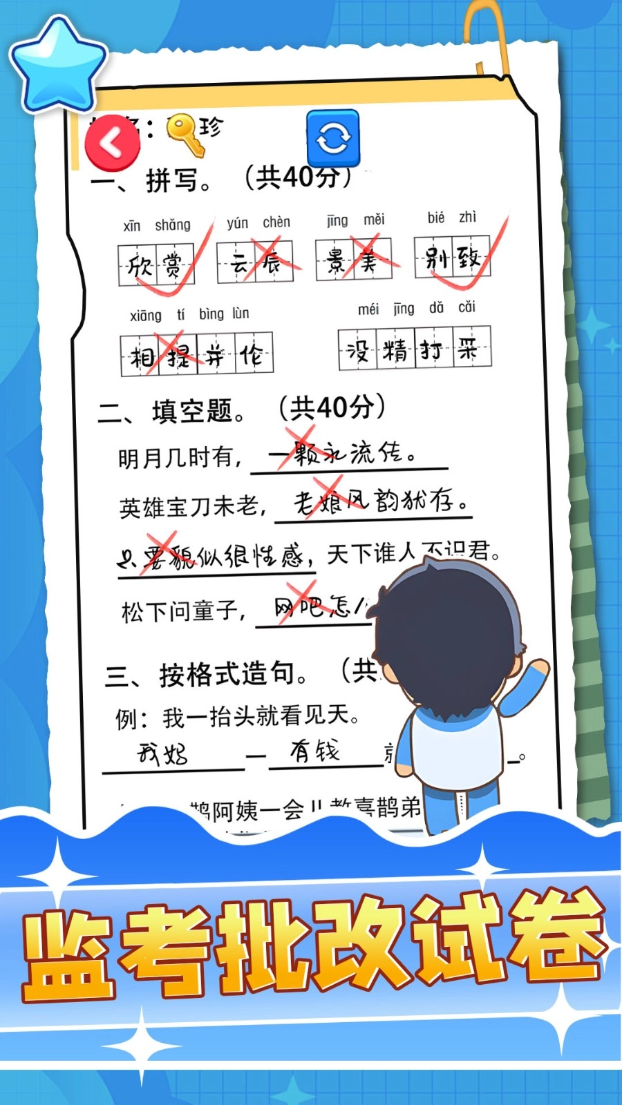 5、批改试卷找出错误进行改正,任何细节上的错误都要点击找出,以此体验到多种不同的趣味内容。