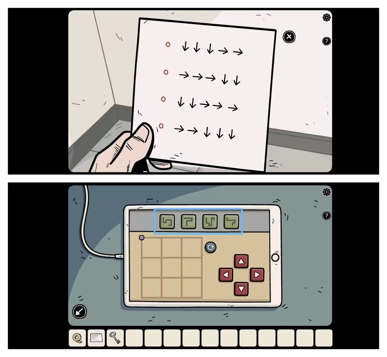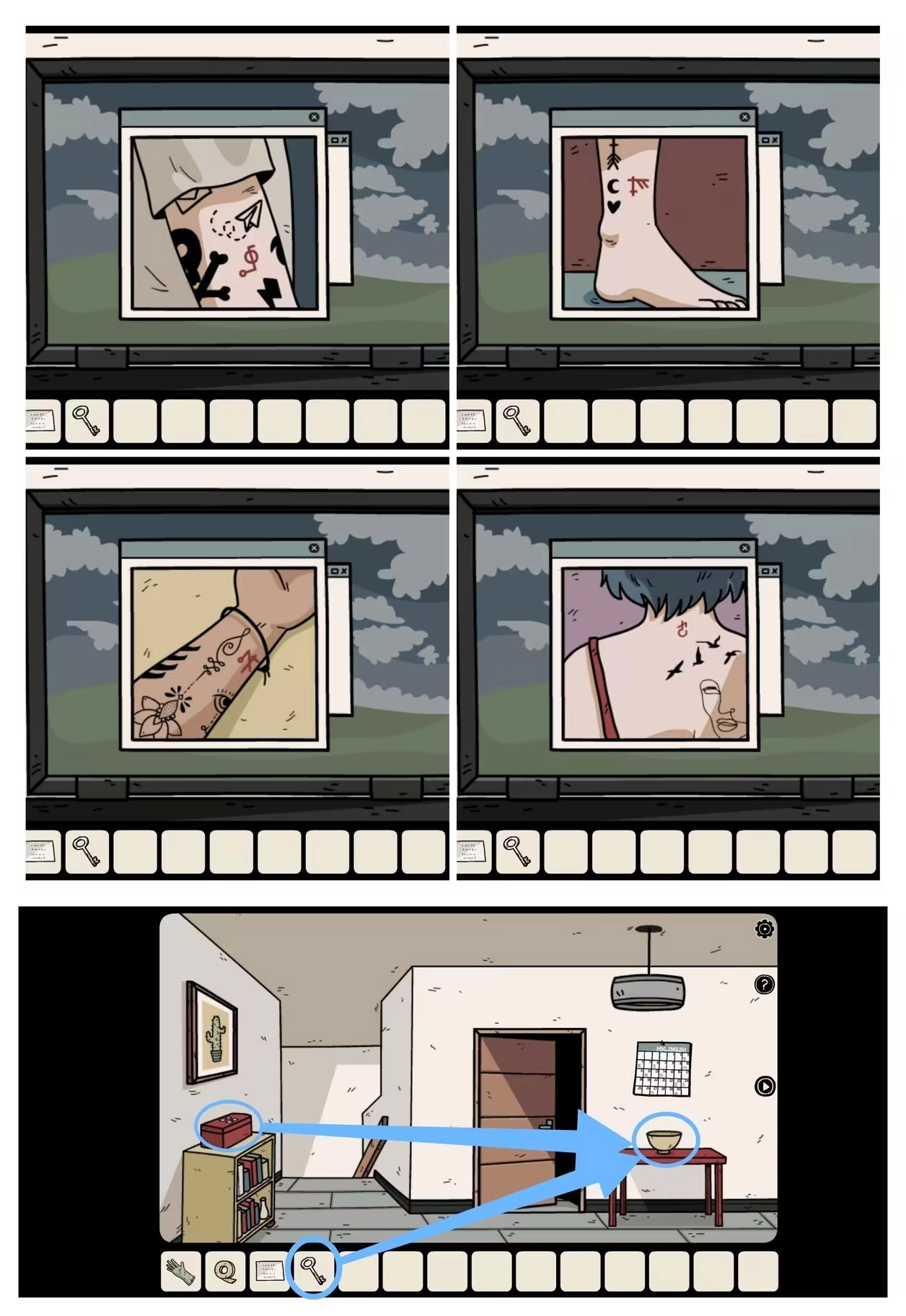 9、用钥匙打开右侧的棕色门,进入房间拿走左侧柜子上的「皮包」,再观察窗外四个小黑固定的行走路线获得图形密码(如上图)。