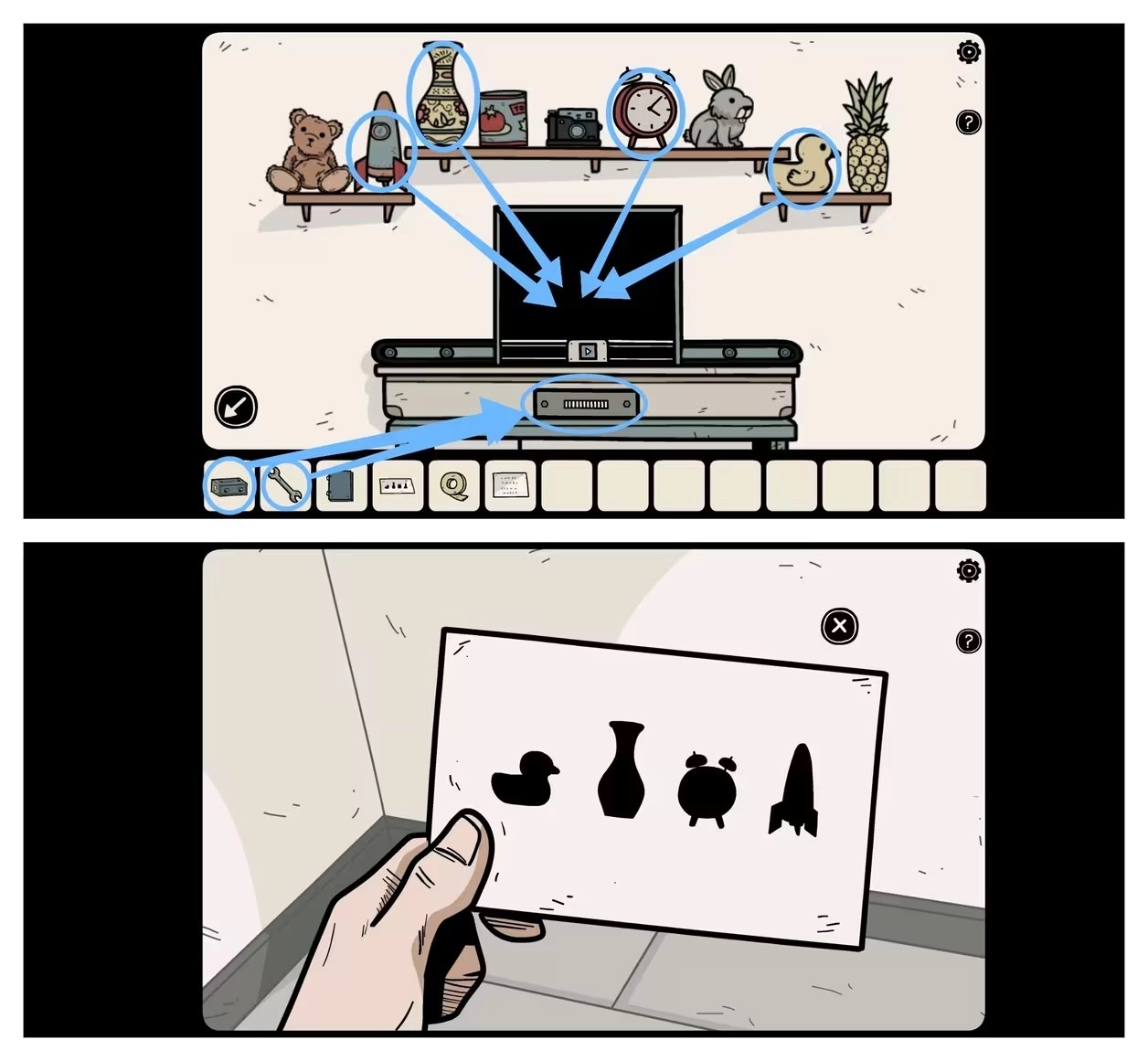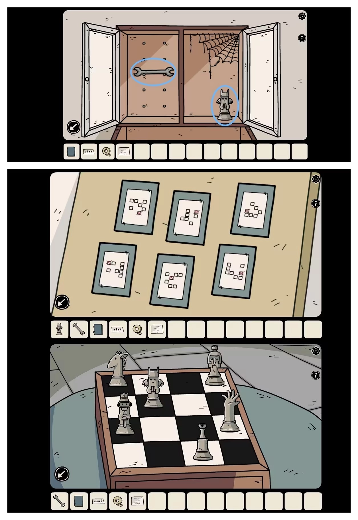 7、输入符号打开书柜,从中取出「扳手」与「棋子」,随后查看留言板上的卡片(留意每张卡片上棋子对应的具体位置),再按照正确位置摆放棋盘上的棋子(参考上图所示),即可得到「电池」。