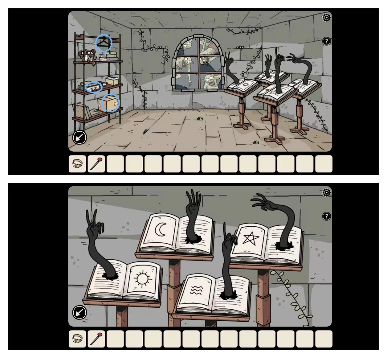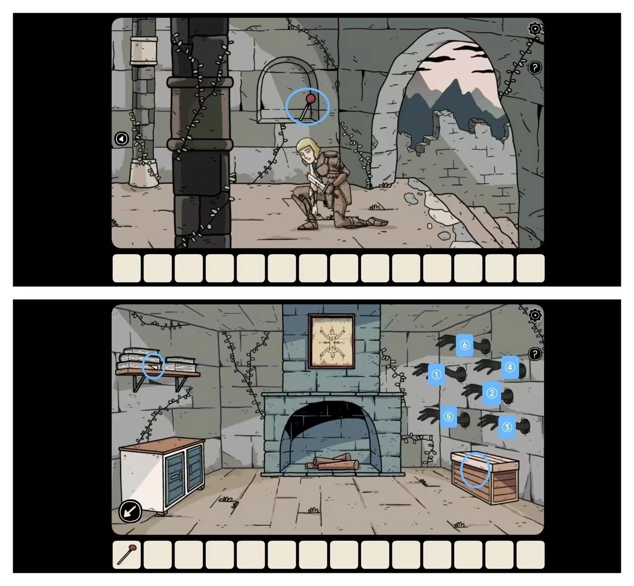 1、从地道出来先往左走拿到「杠杆」,再进入蓝色门房间,按顺序(如上图)点击右侧的黑手打开箱子拿到里面的「戒指」与「旧钥匙」。