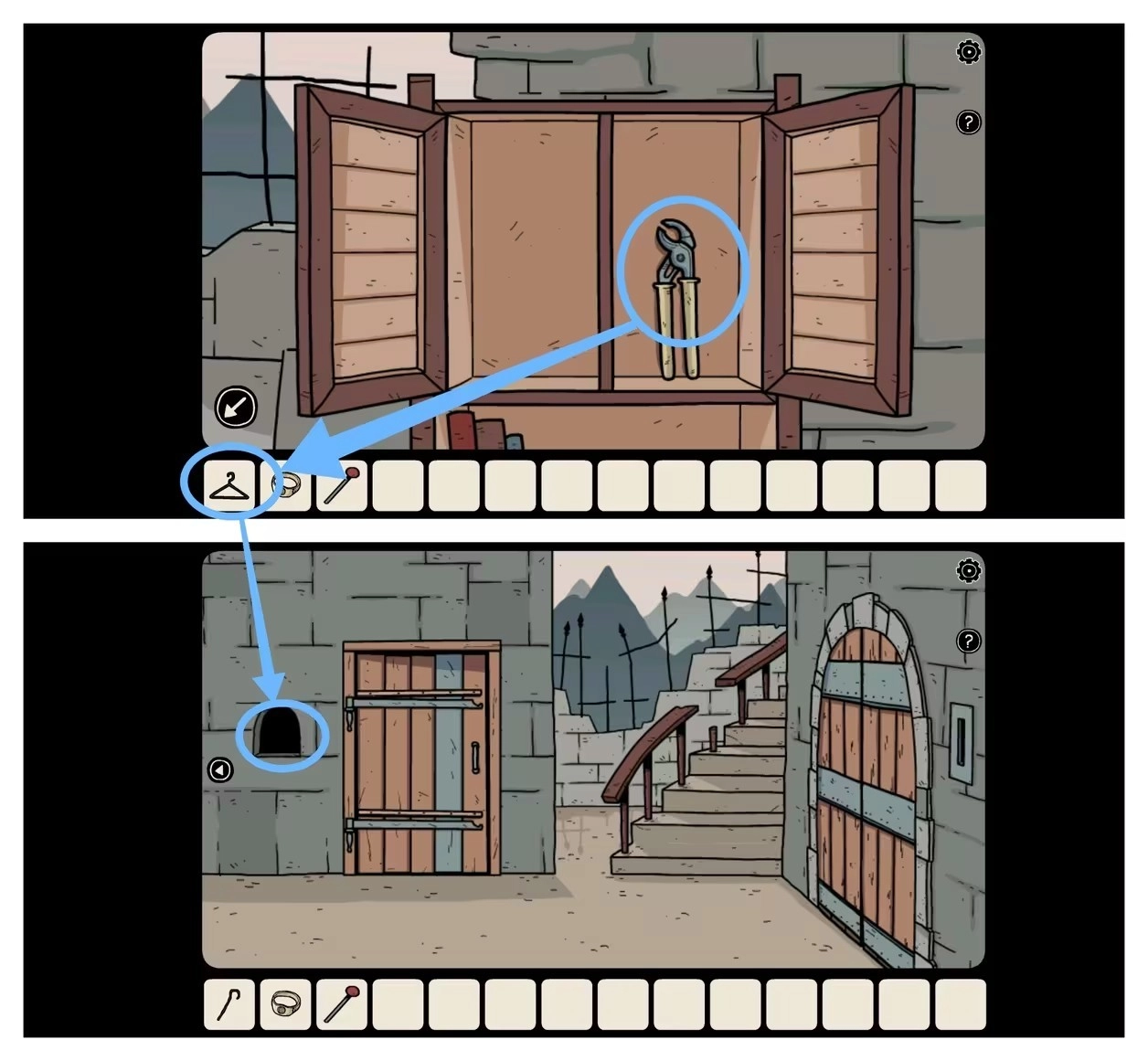 3、回到地道口,根据符号密码打开右侧的柜子拿到道具「断线钳」,再和衣架组合成「钩子」打开右边第一道门(如上图)。