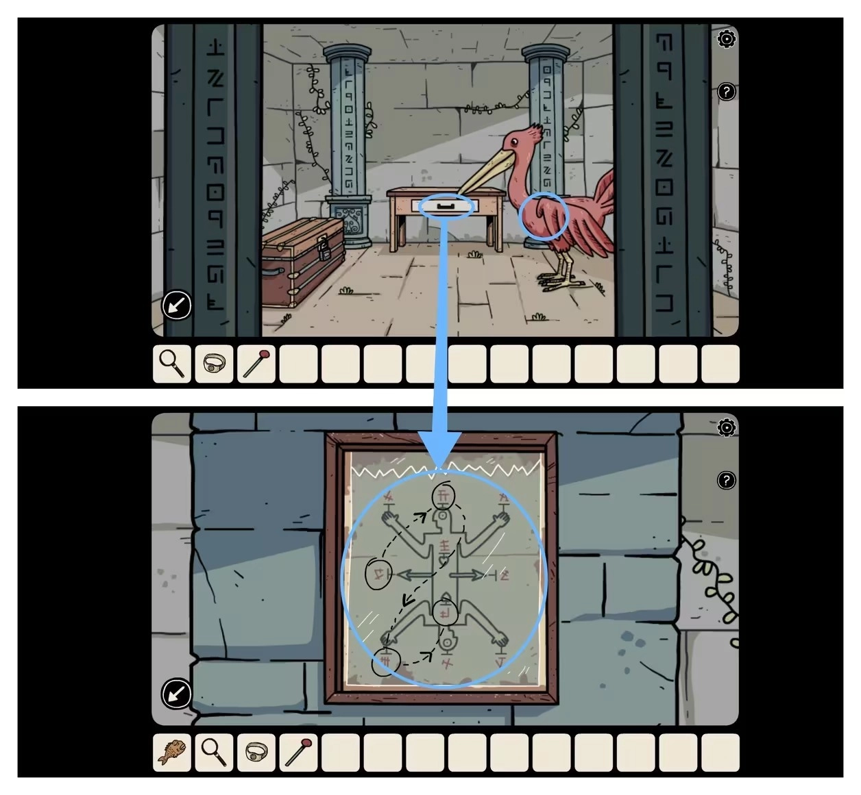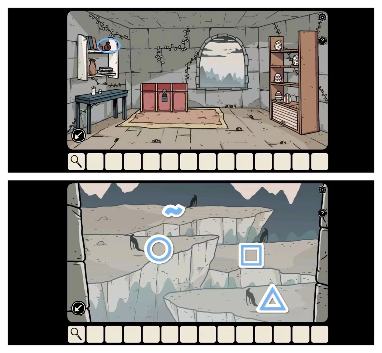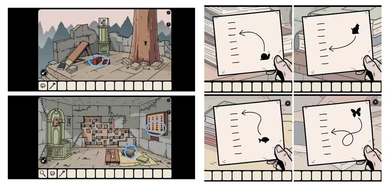 11、把沙子装进山顶树洞的沙漏里,借助放大镜观察得到四个「符号密码」,之后前往棕色房间打开箱子拿到「鸟食」,再去二楼红色房间把鸟食喂给怪鸟,就能获取「鸟蛋」以及另外四个「符号密码」。
