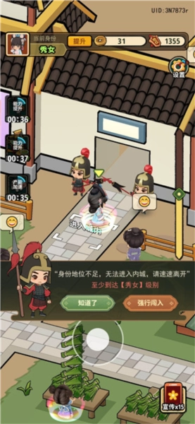 1、首先地位需要达到“秀女”以上才可以进皇宫,地位不够的是没有办法进去的哦