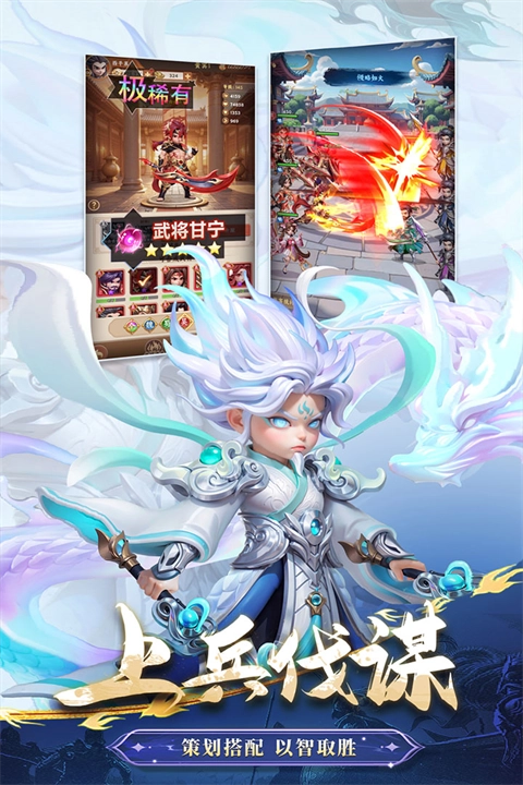游戏采用Q版古风美术风格,打造了城池、荒漠、雪山等多种不同风貌的场景,武将立绘细腻精致,技能特效更是华丽夺目、极具视觉冲击力。竖版视角的设计,让玩家单手就能轻松实现流畅操作,在保证策略深度的同时,也兼顾了操作的便捷性。