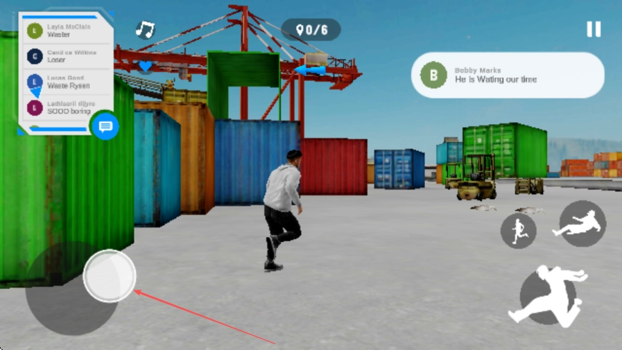1、进入游戏,利用左下角虚拟摇杆操控角色在集装箱区域移动。