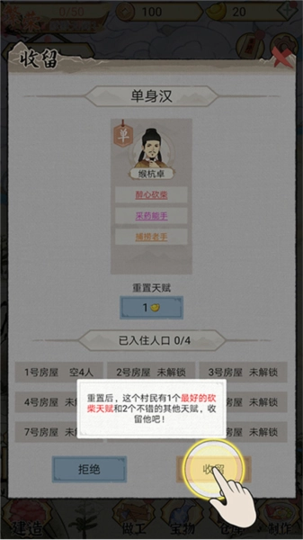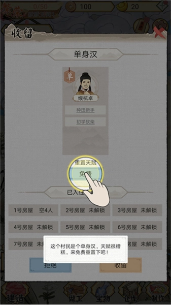 4、重置后,可看到获得了新的天赋,我们可以选择将他收留,同时为他安排房屋入住;