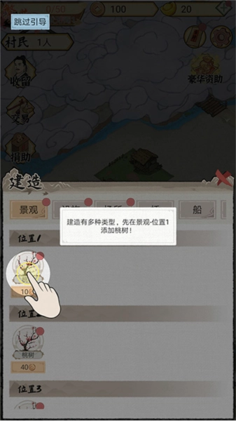 9、进入建造界面,包括景观、设施、场所、桥、船等多种类型,这里以【桃树】为例,选择解锁即可;