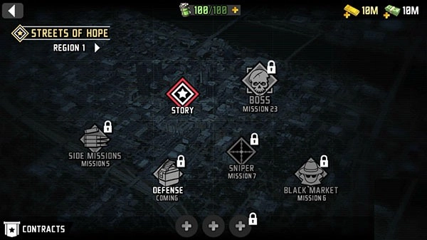 1、进入最后的希望3游戏,右侧的红色按钮是任务提示,右上角是金币和钞票显示。