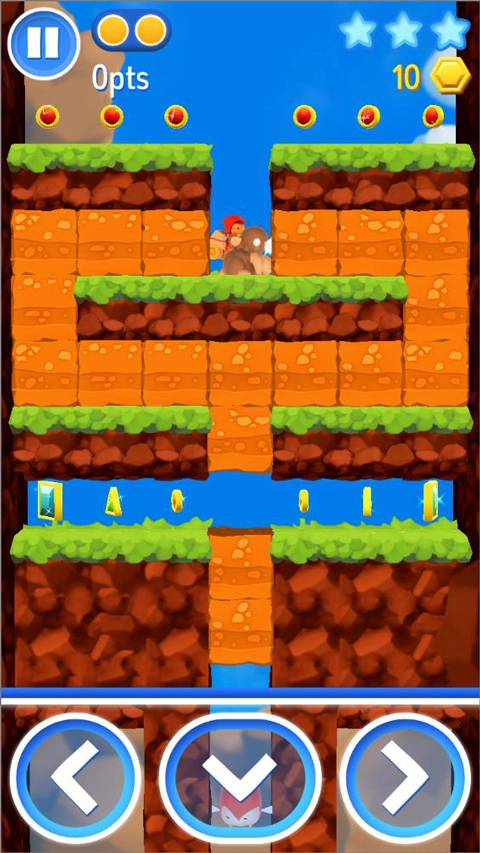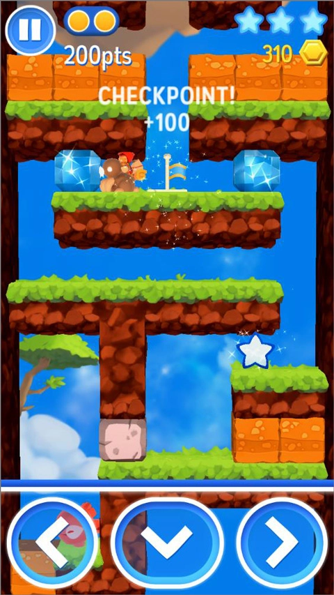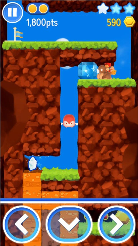 接下来要收集第一颗星星,不过得先把挡路的怪物解决掉才行。拿到彩色花朵的增益效果后就全力冲刺!然后赶紧挖掘石块去获取第二颗星星。到了底部,先拿炸弹炸开冰块,推动三块石头后进去拿到钥匙,再下到最底层打开宝箱。
