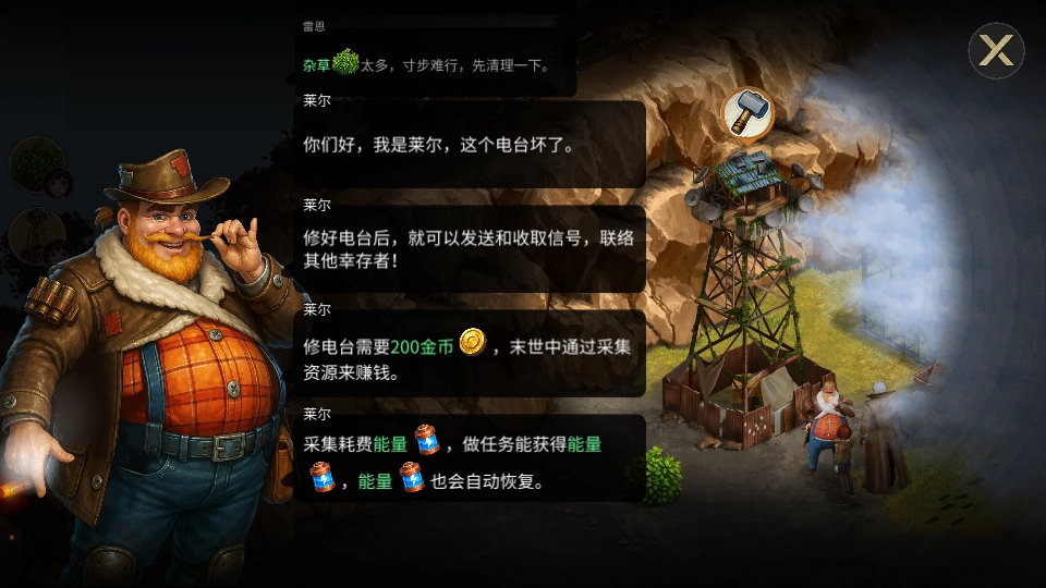 2、野外的资源清理或者采集需要消耗能量,资源一般用来建造建筑,能量可以通过任务获取或自动回复。