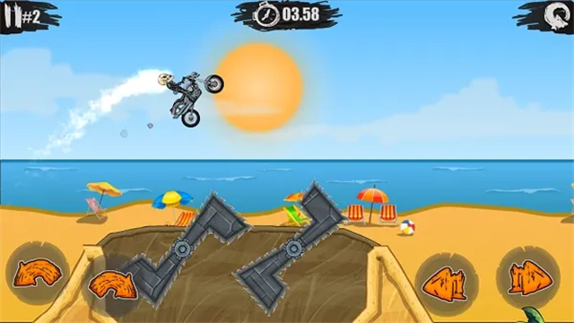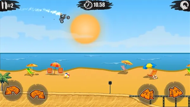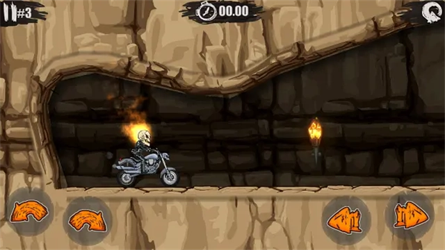 操作方式:采用虚拟按键或重力感应等控制方案,玩家可借助右下角按钮操控摩托车前进与后退,通过左下角按钮调节车身翘头角度,需协调各项操作以维持行驶的稳定性和速度。
