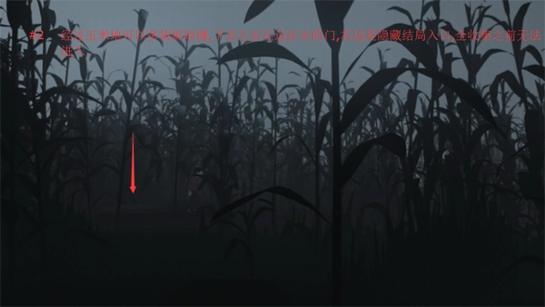 2、路过玉米地时可以多按几次抓取键 下去之后,左边是那扇发红光的门,右边则是隐藏结局的入口,不过在完成全收集之前是进不去的