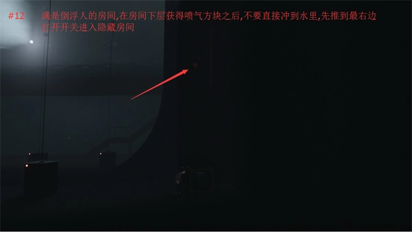 12、房间里满是倒吊人,在经过房间下方喷火的喷气方块后,别直接冲进水里,要先推到最右边打开开关,进入隐藏房间。