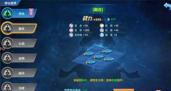 3、境界系统:初期需达成特定境界,玩家才能让多个英雄同时上阵;境界还能为玩家提升战力,玩家可消耗真气来提升境界等级,而真气的获取途径十分丰富,包括门派比武、天命之塔、野外探索等玩法。
