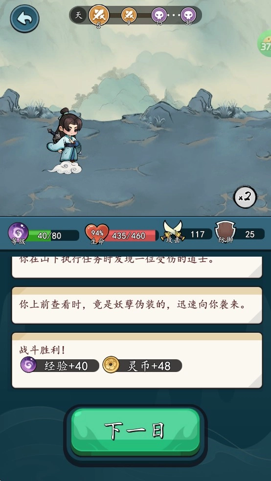1、踏入梦仙灵游戏开启妙趣横生的游历之旅,每日都有随机剧情上演,还会出现随机属性与技能供玩家挑选。前期建议优先提升攻击和生命属性,只要坚持到第30日,就能轻松完成通关