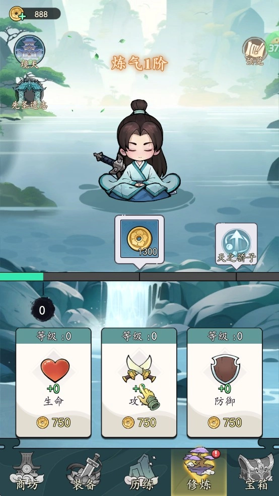 3、打开装备界面,把闯关得到的装备给角色穿上,再用道具一键强化,之后进入修炼界面提升生命、攻击和防御属性,就能继续历练了。